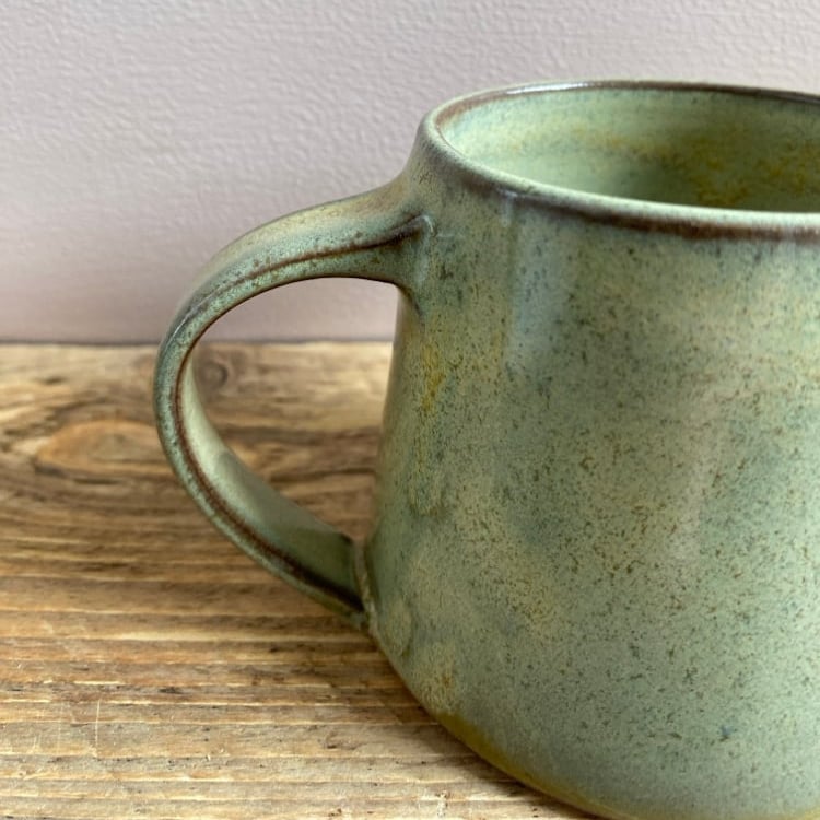 Low tapered mugs in glossy tundra glaze breaking to brown at the edges.
